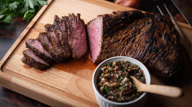 The only essential detail to keep in mind with the tri-tip is that it must be cut against the grain once the beef has rested and is ready to serve. After that, it's up to you. There are a ton of top-notch tri-tip recipes out there and even more sides that complement this easygoing cut of meat. A personal favorite tri-tip meal that's never failed a dinner party is tri-tip with Caesar salad and garlic bread. Simple, delicious, and easy enough to pull off under pressure.