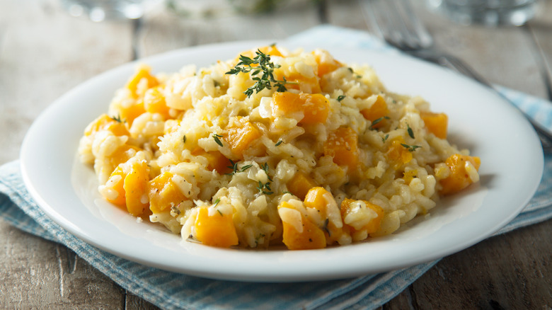 The chef also emphasized the importance of having a good stock. "If you want to keep it vegetarian, you make a good stock with all the leftovers — the top of the leeks, the top of some of the carrots." Then, if you're making the butternut squash risotto that Bastianich recommends, add the squash in once you begin to wet the rice with the stock. "The flavors come at the end when you do the mantecare, when the squash has released its flavors a little bit, and it's always broken down a little bit in the risotto. The rice has made its cream ... Then you put [in] your butter and cheese, and you should have a great risotto."
