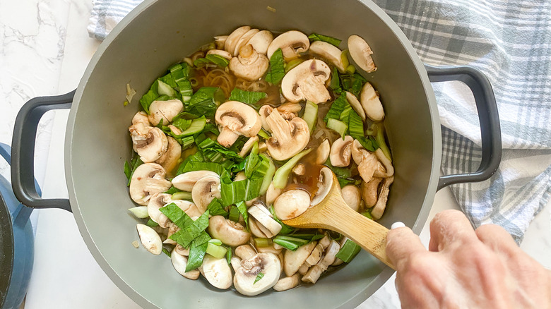 Now you're ready to add the final ingredients and finish off this hearty soup. Add the bok choy, mushrooms, and uncooked noodles. Cook for about 5 minutes on medium or until the noodles are done and the bok choy is tender. Add the seared tofu and the leaves of one baby bok choy.