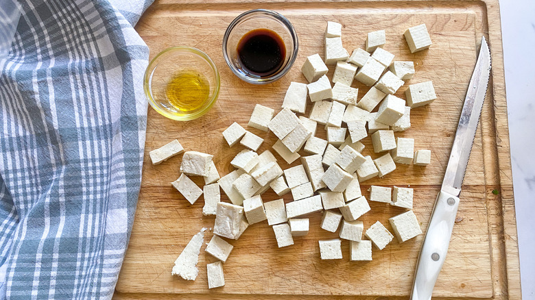 Start with the tofu because you'll need to marinate it before searing it. When using super firm tofu, you only need to remove it from the package and dry it off with a paper towel or clean dish towel before cutting it into bite-size cubes. If you're using firm tofu, you'll want to press some of the liquid out of the tofu.