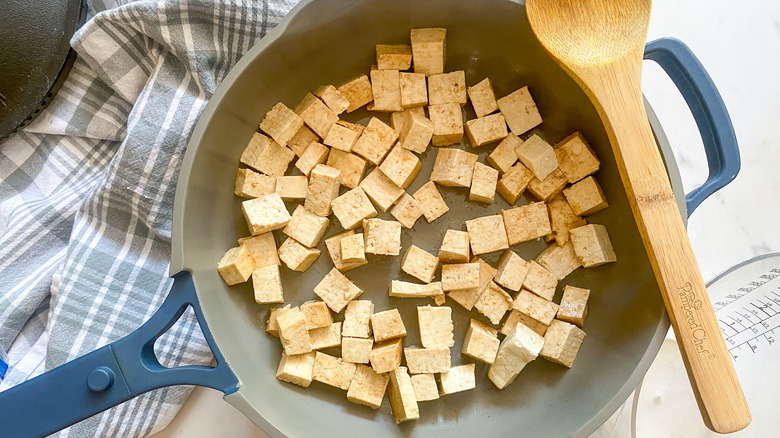- Heat up a frying pan to medium heat and add 1 teaspoon of oil. Drop in the tofu with the marinade. Cook for 10 minutes undisturbed, then flip the tofu over and cook for 10 more minutes so that both sides are lightly browned.