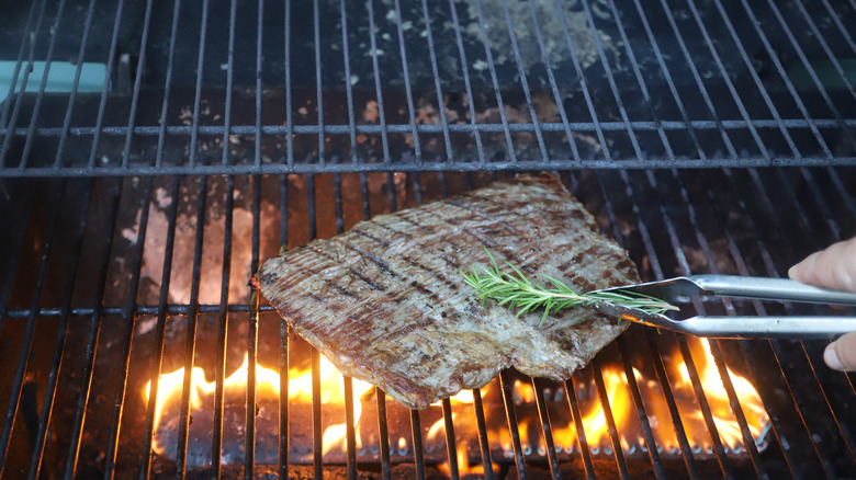 First, choose your steak. While this recipe can technically be made with many different cuts suitable for the grill, Murray likes flank steak because it's easy to cook and affordable. The beef will be seasoned with olive oil and a sprig of rosemary.
