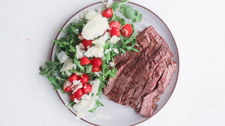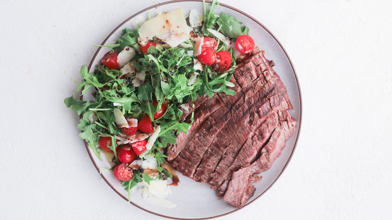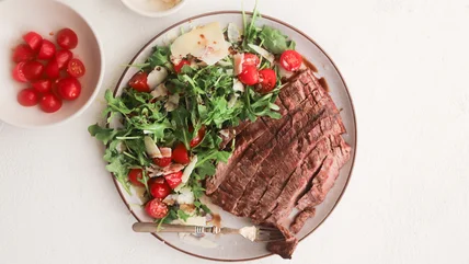This interpretation of a classic beef tagliata includes arugula, ripe cherry tomatoes, and balsamic vinegar to make the perfect summer meal.