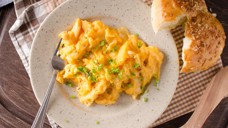 If you add your cheese too soon, it will become a cheesy gooey mess and won't look anything like scrambled eggs. Add it too late, and it's an afterthought. And if you are wondering how much cheese to add, it is approximately 1 tablespoon of shredded cheese per egg. Anderson explained that making scrambled eggs uses the same philosophy as barbecue. It's all about slow and low heat cooking. That is unless you want rubbery scrambled eggs, and no one wants that.