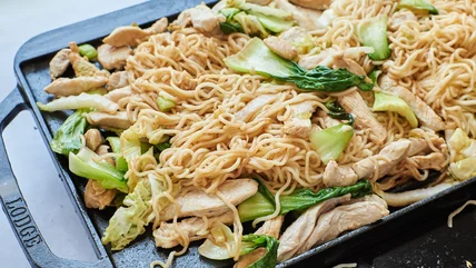 Yakisoba is made in parts, moving the elements around the griddle to cook everything evenly. Because the chicken takes the longest, season and add it to the griddle first, browning it deeply on all sides. Once browned, move the chicken to the side of the griddle, away from the direct heat. Add the scallion and cabbage (or any hardy vegetables like peppers) and cook until just softened. Move these to the side of the griddle, away from direct heat. Add the bok choy and cook until browning on the edges; the leafy parts will be soft and bright green.