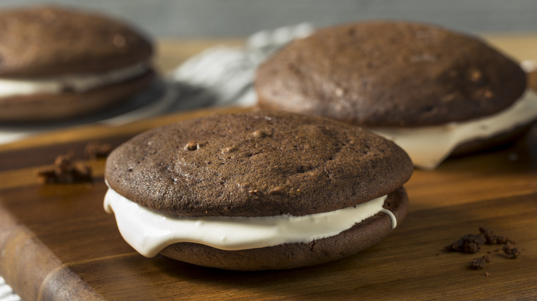 One of the best things about whoopie pies is that they're incredibly customizable. For example, even though marshmallow creme is the traditional filling, you could also use buttercream. If you're really feeling creative, you could even change the flavor of both the filling and the cake to create a totally unique whoopie pie. From a reverse whoopie pie with a vanilla cake exterior and a chocolate middle, to a red velvet whoopie pie with red velvet outsides and cream cheese filling, the possibilities are endless. Of course, it will probably help to make the original variation first, so check out our old-fashioned whoopie pie recipe to get some practice in.
