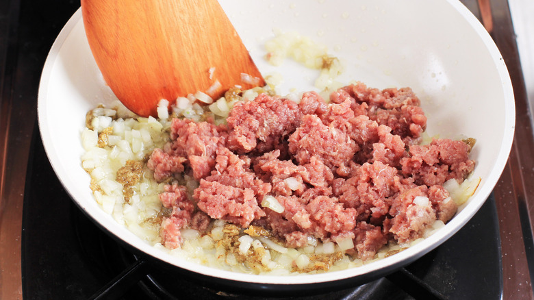 Not to state the obvious, but sautéing ground beef, raw chicken, or fatty pork lardons simply makes for better aesthetics. Where meat cooked directly inside a casserole tends to have a muted hue, lightly browned meat is significantly more appealing to see layered inside the finished dish. Plus, let's not forget that while cooking from raw might save you time during prep work, skipping the browning process will only result in tacking on additional cooking time.