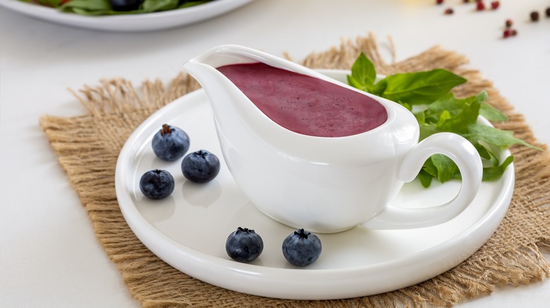 If you've ever spent time in Maine, you know blueberries can be incorporated into pretty much any dish. Although blueberries make an appearance in salads all over the United States, the state of Maine does a particularly good job at going the extra mile and using their extra small, extra powerful berries in just about everything, including vinaigrettes. Any variety of blueberries, however, can make for a colorful, flavorful salad dressing. Although blueberries are dark blue on the outside, they become purple when mashed, and like most berries, they have a delicate seedy crunch to them; if you enjoy that texture, be sure to blend or mash the berries instead of juicing them.