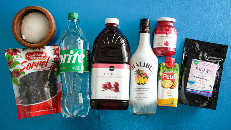 Next, pink rimming sugar is a must in order to bedazzle your glass. The rest of the drink consists of pineapple nectar or juice, cranberry juice, Malibu rum, and Sprite for a fizzy touch. If you want to make your cocktail extra special, Murphy-Lowe suggests adding pineapple slices and leaves, as well as Maraschino cherries, as garnishes.