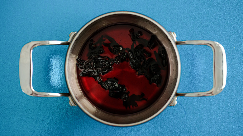 Next, set a small saucepan on the stovetop and add the water, sugar, and dried hibiscus flowers. Then, turn the burner to medium heat and bring the mixture to a boil. Keep stirring while you heat the contents for 5 minutes or so until the sugar dissolves. Then, take the saucepan off the stovetop and leave the hibiscus to steep in the syrup until the liquid becomes dark red. At this point, use a strainer to pour the syrup into a separate bowl, leaving the flowers behind. You'll want to set the syrup aside to cool completely before using it for the cocktail to avoid immediately melting the ice.