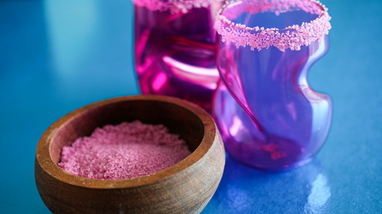 To enhance this drink beyond a mere rum cocktail, a bit of glitz and glitter is in order. Pour a few tablespoons of rimming sugar into a bowl and lightly dampen the rim of 2 cocktail glasses. Then, dip the rims one by one into the sugar in order to coat them in pink. Once the glasses are garnished with sugar, set them aside until you're ready to pour the drinks.