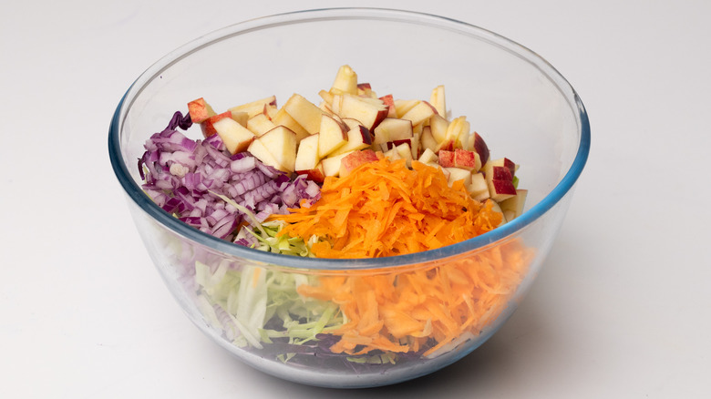Next up, it's time to get chopping. Grate your carrot and slice up your cabbages and the red onion. Put them all in a large bowl. Then, chop the apples and add them to the same bowl. It's important to make sure you chop the fruit last so it doesn't start to oxidize and turn brown before you mix it with the dressing, Rye explains. Once the apples are mixed in the salad, she says, "they last really well."
