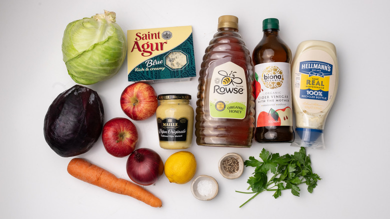 Before you start mixing and chopping, check your fridge and pantry for common staples required in the dressing for this recipe, including mayonnaise, honey, apple cider vinegar, lemon juice, Dijon mustard, and salt and pepper. For the salad itself, you'll need a carrot, red cabbage, white cabbage, a red onion, apples, blue cheese, and fresh parsley.