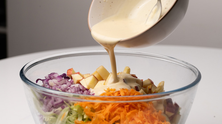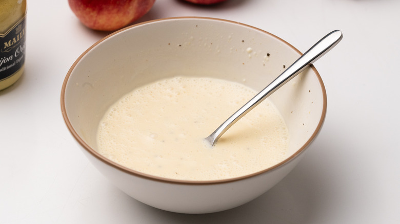 The first step is to whip up the dressing for the slaw. You'll simply mix together the mayonnaise, honey, apple cider vinegar, lemon juice, Dijon mustard, and salt and pepper. You can add those last 2 seasonings to taste, so make sure you test the flavor of the dressing to make sure it's where you want it to be. Also, keep in mind that the acidic apple cider vinegar and lemon juice play an important role not only in flavor, but also in keeping the apples fresh-looking rather than brown, so it's best not to skip or adjust those ingredients.