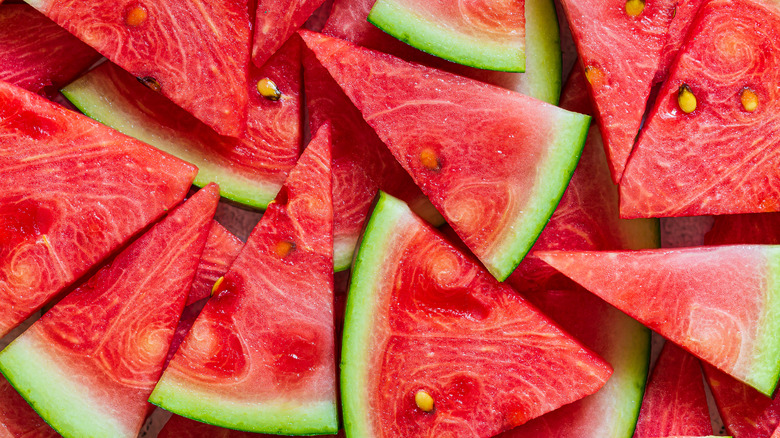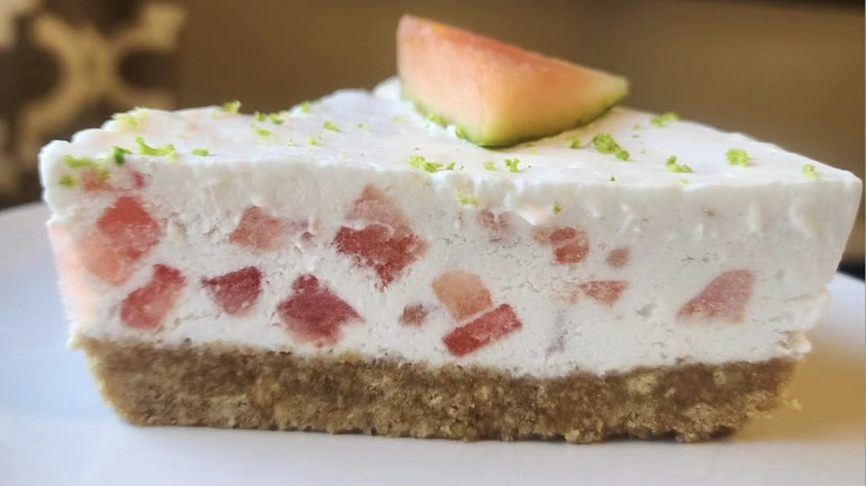 This particular recipe comes from the brilliant mind of blogger and TikToker @thepalatablelife. They kick things off with a homemade buttery graham cracker crust, the only element of the pie that requires you to turn your oven on. From there, the pie is an icy blend of drained, cubed watermelon, cool whip, sweetened condensed milk, and plenty of bright, tangy lime juice. The final pie has a chiffon-like lightness with a flavor that swirls a fresh watermelon taste with the popular key lime pie formula. Finished with lime zest and thin slices of fresh melon, it's uncomplicated elegance at its best.