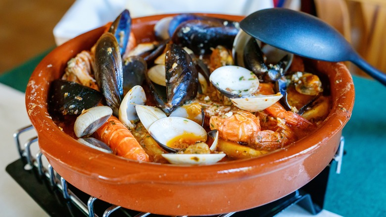While these rounded cooking dishes come in variety of sizes (from several inches to feet), the Food Network star prefers cazuelas that are around eight inches in diameter (via Bon Appetit). Unlike aluminum or stainless steel, Flay told The New York Times that he prefers cazuelas because they "have a very even heat, like the al forno dishes in Italy."