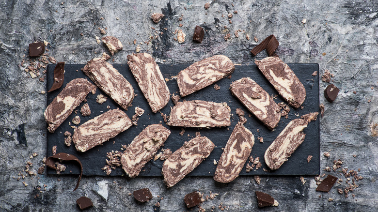 Halva (also spelled as halawa and halvah, among others) is thought to have originated in the eastern Mediterranean region and has left its mark in countries like Turkey, Greece, Lebanon, and even as far as India. The reason for its widespread presence and murky beginnings is due to it being absolutely ancient, with evidence of its existence dating back as far as 3000 B.C. As such, it is no surprise that this storied sweet consists of a minimalist set of ingredients. In its purest form, it can be made by mixing tahini, a paste of ground sesame seeds, with heated sugar syrup and allowing it to cool to form a solid block. The block is then sliced into smaller sections for serving.