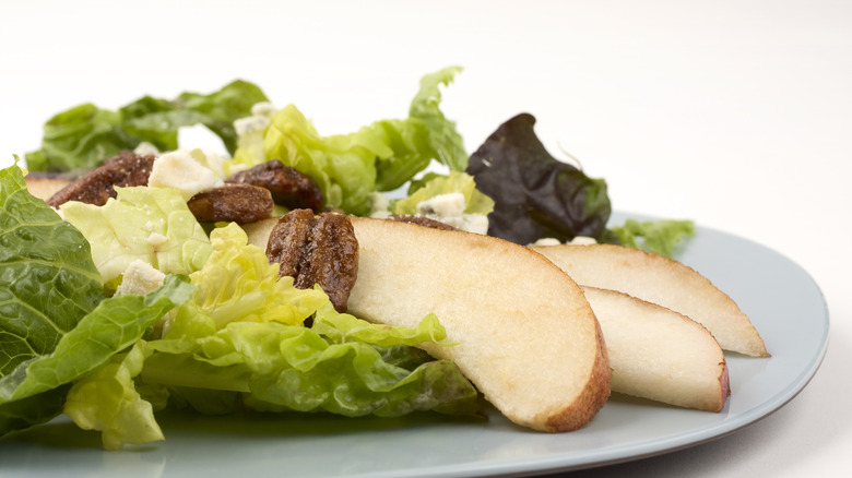 Pears are crisp yet soft and buttery with almost honey-like notes. They pair beautifully with dairy products like cheese and ice cream and are enjoyed both hot and cold. This is why recipes like roasted pear and manchego salad, or sliced pear on prosciutto pizza are so popular. And when it comes to salads, pears are no strangers. Consider adding canned pear to your salad, and include plenty of salty and savory additions like nuts, cheeses, and crispy cured meats. Use the syrup from the can to sweeten your dressing and create consistency throughout the dish. In fact, you're not going to want to waste any of that pear juice — thanks to its honey-like flavor, it's delicious in cocktails, marinades, and even added as a sweetener to baked goods.