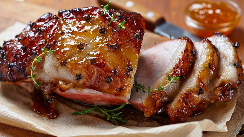 It's no secret that glazed ham is usually doused with oodles of brown sugar or honey to give it that crispy rich sweetness we so desperately crave around the holidays. This year, instead of sticking to basics, try something a little more unique that's loaded with layers of flavor beyond just sugar. Apricots are famous for pairing beautifully with pork, as they are sweet, floral, and often described as tasting like a cross between a peach and a plum. Instead of using apricot jam for a delicious apricot honey glazed ham, consider using mashed canned apricots.