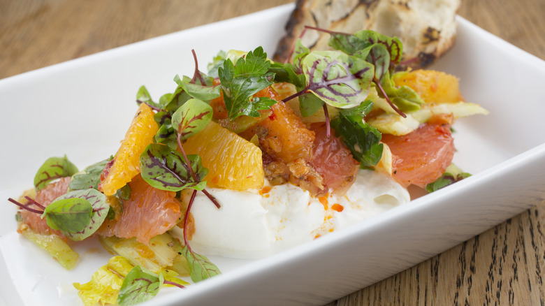 Grapefruit is one of those hit-or-miss citrus fruits that people either love or can't fathom eating raw. Red grapefruits are the sweetest variety, but overall, the aromatic fruit is intense, tangy, and a bit tart for some palates. Those who jump in spoon-first — no brown sugar or broiling necessary — fully appreciate grapefruit's intensity and potential. And if this fruit is on your radar in any capacity, whether it be as a breakfast food or a juiced cocktail mixer, you should consider adding it to your summer salads. Canned grapefruit is quite tender, and tends to blend better into a salad than one that's been peeled and sectioned. If you cut chunks out of a grapefruit, you risk losing quite a bit of the juice, so make your life simple and grab a can opener instead.