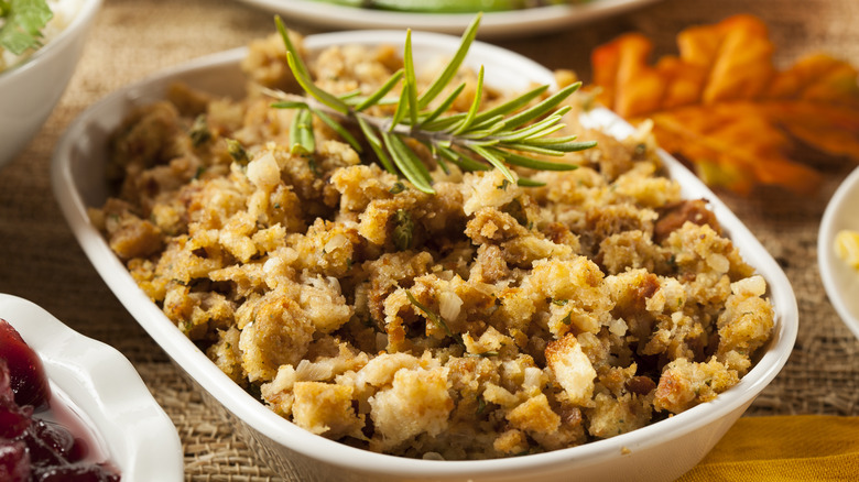 While fruit isn't typical in such a dish, we believe that it's one of the best ingredients you can add to your stuffing because it creates a subtly sweet balance of flavor to all of the savory goodness. When selecting apples, spring for the canned version. These will be much softer than freshly sliced apples, and will almost melt right into the bits of bread. Be sure to choose canned apples that are unseasoned and packed in water, rather than syrup, to avoid over-sweetening the dish. The purpose of the apples is to complement the sausage and sage, not to become the star ingredient. Add just a handful of canned apple chunks and let the oven do the rest.