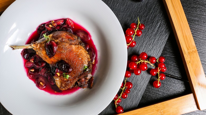 Use the syrup from canned cherries to create a sweet glaze for crispy roasted duck. Stuff your poultry with the dark cherries, and leave some around the base to mingle with the herbs, spices, and drippings. Consider blending some of the soft canned cherries right in with the glaze to give it added intensity and thickness. Don't be scared to include butter, garlic, thyme, and other savory ingredients in your recipe. This will only add to the savory-sweet contrast that we love so much. Even just a light cherry glaze will help to create a bold flavor, so don't go overboard when it comes to dousing on the sauce. Cherries are sweet and bold, so beware of overpowering the duck.