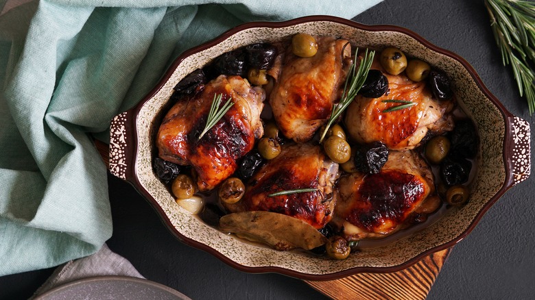 Chicken Marbella often calls for dried prunes, but using a canned prune can result in a juicier textured fruit, along with an opportunity to include undertones of prune in the sauce at a higher concentration, using the syrup. And although some may find prunes to be an unusual ingredient in chicken Marbella, it's actually quite common to pair stone fruits with meat, especially poultry.
