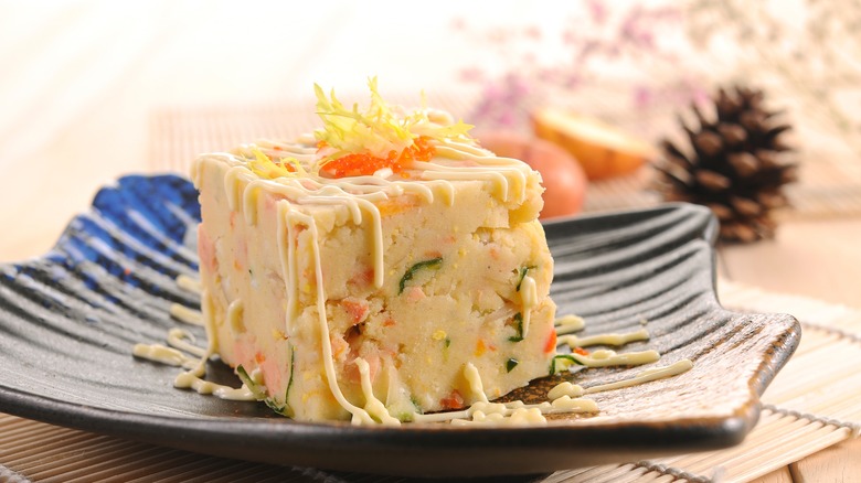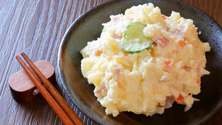 However, Japanese recipes favor starchy spuds that make for a rich, creamy salad and are more likely to fall apart, like russet and Idaho potatoes. The mashed spuds tend to include kewpie mayo and rice vinegar, as we've covered, but the rest of the ingredients in the salad vary, much like with American-style recipes. You'll generally see a variety of colorful veggies and proteins — some recipes call for boiling the spuds with carrots to enhance their sweetness and many include cucumber, onions, and corn on their ingredient list.