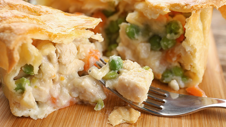 Just like in many cobbler recipes, you'll start off by melting a stick of butter in the oven in a baking dish. Then you'll add layers of rotisserie chicken, frozen peas and carrots, a biscuit mixture, chicken stock, and a cream of chicken soup. You'll get warm layers of chicken, buttery biscuit, veggies, and the soup, which plays the role of a gravy when you take a bite. It's full-on comfort food that requires hardly any prep time.