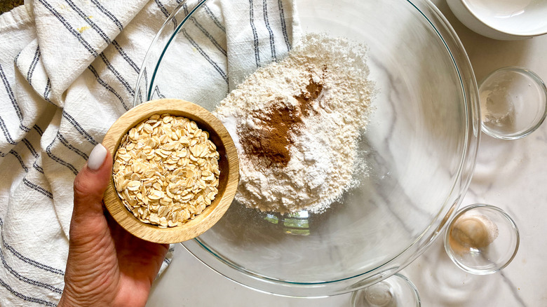 Start by preheating the oven to 400 F. In a large bowl combine the flour, some oats, baking powder, baking soda, and cinnamon. "I'm using both baking powder and baking soda in this recipe because we're going for some high-rise volume. As a side note, make sure that your baking powder and baking soda are both no more than six months old as this can affect the final result," Hahn explains.