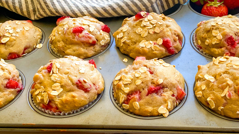 We love this recipe because it involves basic pantry staples with the addition of freshly diced strawberries that you'll enjoy in every bite. Should you want to take your muffins to the next level, you could easily do so by sprinkling some raw sugar on top of the finished product or including another fruit in the mix, like blueberries. For the simplest iteration of the recipe, however, there's only 30 minutes separating you from simple yet wholesome strawberry muffins.