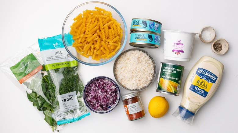 To make this tuna pasta salad recipe, first, you will want to gather the ingredients. You will need fusilli pasta, crème fraiche, mayonnaise, a lemon, dill, basil, canned tuna, a red onion, canned corn, and salt and pepper. Additionally, to create the paprika crumb topping, you will want fresh breadcrumbs and ground paprika.