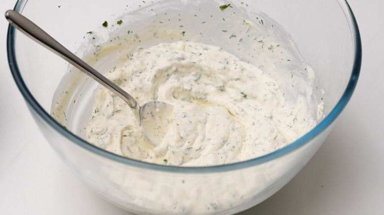 - In a large bowl, mix together the crème fraiche, mayonnaise, fresh chopped dill, fresh chopped basil, lemon juice, and salt and pepper, to taste.