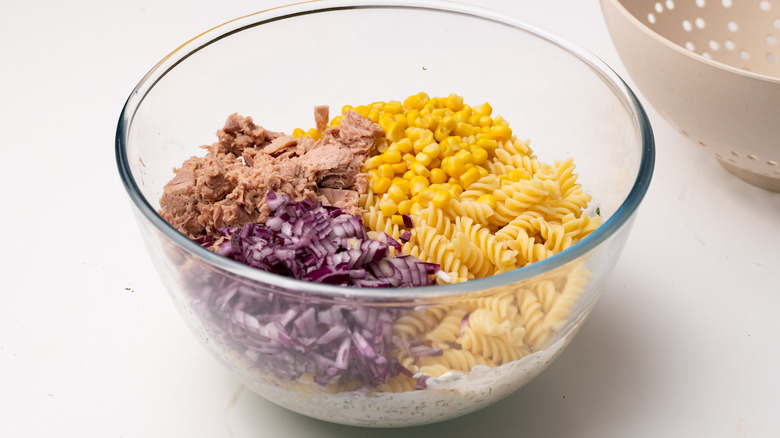 - Add the cooled pasta, the drained tuna, the chopped red onion, and the corn to the bowl.