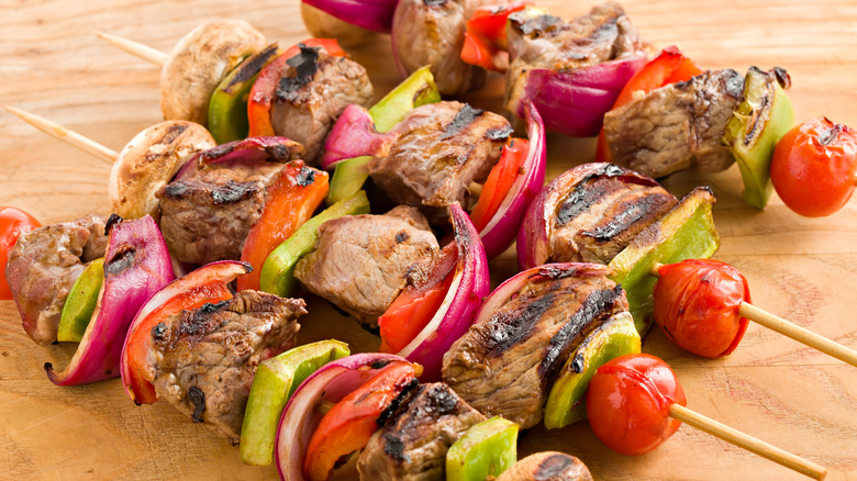 Despite the fact that mixing proteins and vegetables is a great way to add visual and gastronomic variety to skewers, there is a slight problem in doing so — different ingredients cook at different rates. So, to avoid serving raw or overcooked kebabs, it's best to group ingredients with similar sizes and densities together. For example, thinly sliced beef will cook at roughly the same speed as a single onion layer or piece of pepper, whereas a thicker cube of pork will instead fare better when paired with an equally thick onion wedge or chunk of pineapple.