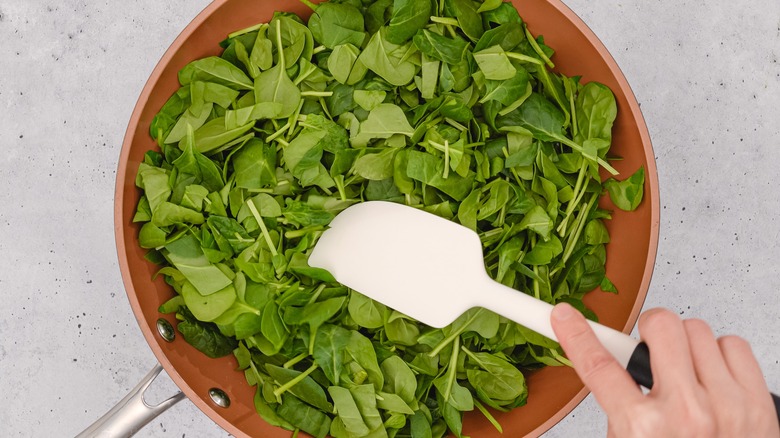 All this research doesn't mean you have to toss out your leftover spinach to avoid overexposing yourself to nitrates, and it is possible to reheat it safely. In short, just make sure you're not heating your spinach at very high temperatures — so try to avoid nuking it in the microwave on full power or stir-frying it on the stove. If you do want to use the microwave, try setting the heat to medium or low and pausing to stir occasionally. This can also be helpful if you're re-warming leftovers that have the veggies mixed in, like a creamy chicken spinach pasta bake.