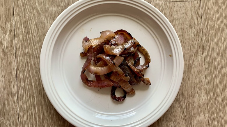 There are many different types of onions, from sweet shallots to sharp red onions. We love them all in different contexts and cooking methods, and do our best to treat them all as best we can by schooling ourselves on their particularities. If you're grilling your alliums, you need to choose a strong flavor that will hold its own against the high heat exposure. Whole Foods adeptly picks red onions, one of our favorites, and only adds three other ingredients: Can you guess what they are? Yes, it's simply olive oil, salt, and pepper. Though it seems like there's very little going on here, your salad can become substantially improved if you ladle a few of these on top of it next time you're at the salad bar.