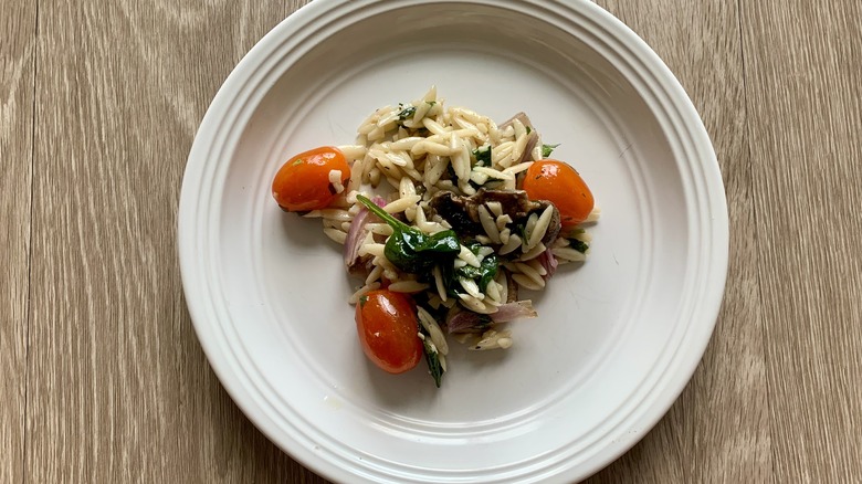 While the salad bar at Whole Foods is already ridiculously convenient. But how about a pre-made salad from the salad bar? It's basically hacking the system, people. It's worth noting, however, that this Lemon Pesto Orzo isn't really a "salad" salad, because orzo is actually a tiny, slippery little pasta. It's a great glue for sticking together some colorful add-ins with a bright dressing. In this case, we have juicy whole grape tomatoes, fresh herbs like parsley and basil, mushrooms, and more. It's convenient to eat, too, because you could practically spoon it into your mouth like oatmeal.