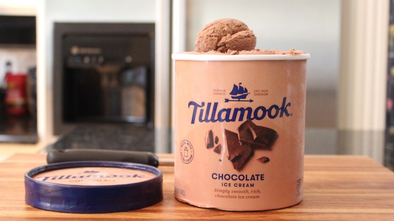 Located in Oregon, not far from the Pacific Ocean, Tillamook is a cooperative of farmers-owners who have been producing all-natural dairy products for over a century. They are committed to producing the freshest, most delicious products without artificial preservatives, colors, or flavors. Tillamook's chocolate ice cream is made from a simple mixture of milk, cream, sugar, egg yolks, cocoa, and natural stabilizers. It is a soft, easy-to-scoop frozen treat with classic chocolate color and taste.