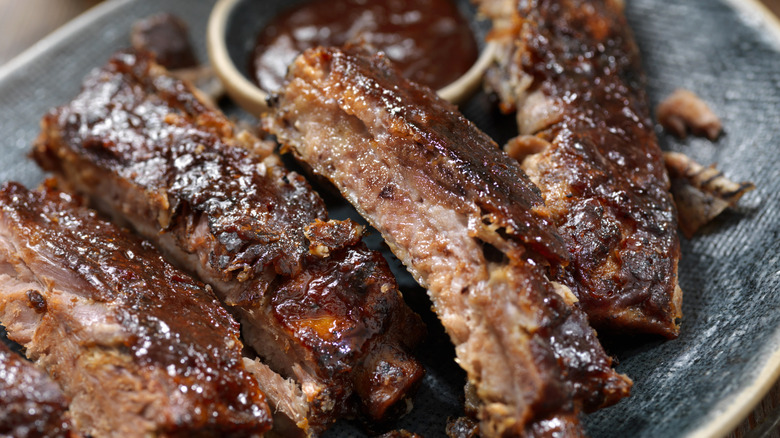 Alternatively, if the ribs don't fit in your slow cooker this way, you can cut them into sections — this will also make it easier to serve guests straight from the slow cooker. Heat the ribs on low for 6 to 7 hours or high for 3 to 4 hours. If you want to add a slight crunch to the top layer of your ribs, you can cook them on a baking sheet in the oven for just a few minutes after they're done in the slow cooker. This step is completely optional, but it does add great flavor and texture to the meat if you're missing that crispiness from the grill.