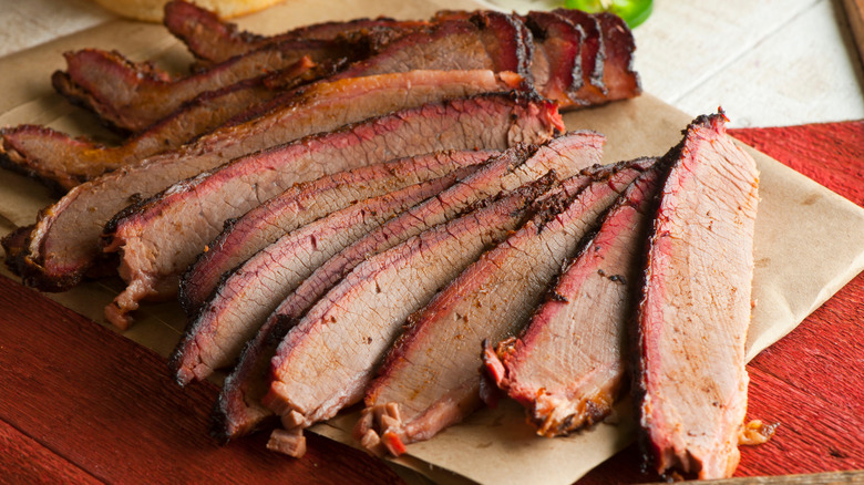 To make a delicious slow cooker barbecue brisket, you'll need a 4-pound brisket, olive oil, fire-roasted crushed tomatoes, brown sugar, apple cider vinegar, Worcestershire sauce, and liquid smoke — a flavoring agent that will give your brisket a smoky taste without having to actually smoke it. Begin by searing the brisket in a large skillet on medium-high heat (approximately 4 to 5 minutes per side) and seasoning with salt and pepper. After transferring the brisket to the slow cooker, add the remaining ingredients to the skillet, stir, then pour the mixture over the brisket. Slow cook on high for about 6 hours.