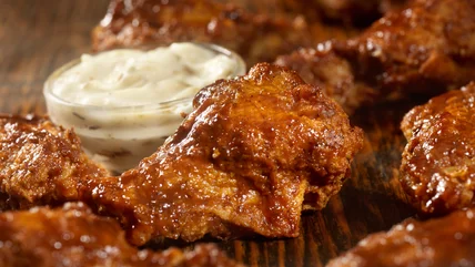 Buffalo wings aren't exactly healthy food, but if you are looking to lighten the dish up with a lower-fat dip option, a simple sour cream and onion sauce may fit the bill. Sour cream and onion dip skips the mayonnaise found in most creamy salad dressing dips. Simply mix sour cream with a little lemon juice or vinegar to bring in some acidity, then add salt and finely minced onions for a savory flavor. For other variations, you can try using caramelized onions or substitute another member of the allium family: minced fresh chives, spring onions, or shallots all provide a flavor boost that will liven up the creamy neutral flavor of sour cream.