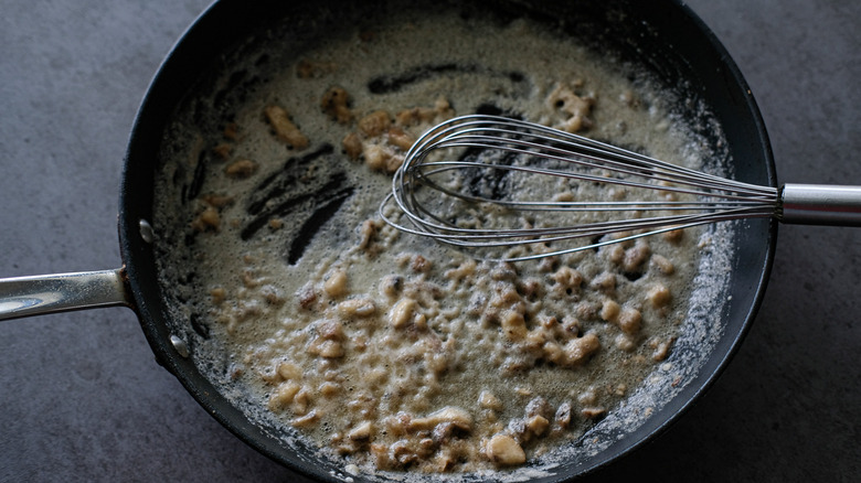 With the mushrooms tender, start making the roux, which is this recipe's special touch. Sprinkle flour over the mushrooms and butter and stir constantly for 1-2 minutes as the flour starts to cook. According to Murphy-Lowe, the roux is what's used to thicken the gravy. "It adds richness and helps achieve a smooth and velvety texture [in] the gravy," she says.