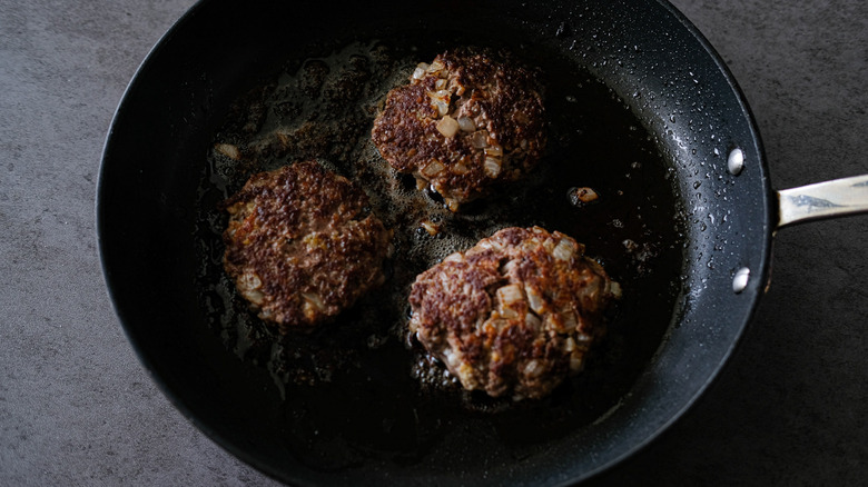 Cook the patties over medium heat in a skillet for about 4-5 minutes per side. Of course, you can also cook them more or less, depending on your personal preference for doneness. Set the patties aside when they're fully cooked.