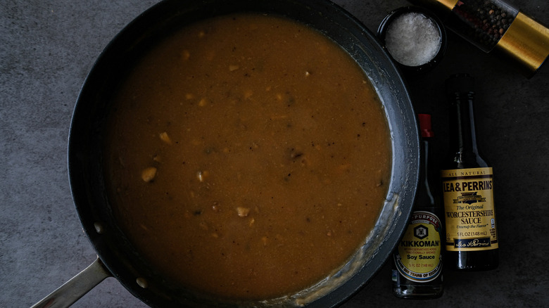 To finish making the gravy, gradually pour the beef broth into the skillet, continuing to stir constantly. Following the beef broth, pour in the Worcestershire and soy sauces, too. "When Worcestershire and soy sauce are combined, they create a rich and savory umami flavor profile. The Worcestershire sauce adds depth with its tangy, slightly sweet, and complex flavors, while the soy sauce contributes a salty and earthy umami taste. Together they enhance the savory character of the dish," says Murphy-Lowe.
