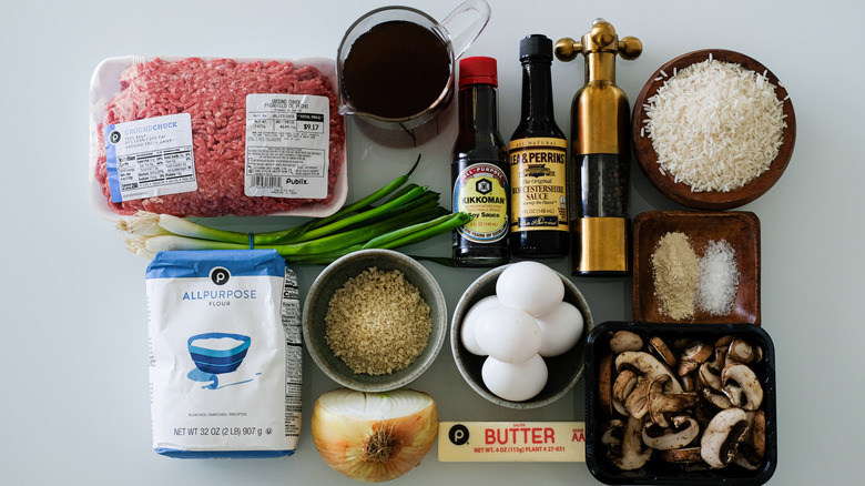 You'll need quite a few ingredients for this recipe because you're essentially working on three different parts: the beef patties, the mushroom gravy, and the items you'll need for serving. For the beef patty, you'll need ground beef, a finely chopped onion, garlic powder, an egg, panko breadcrumbs, Worcestershire sauce, and salt and pepper (which, again, you'll need for the gravy).