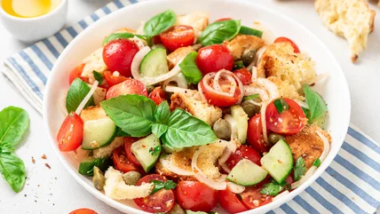 There are few dishes that capture the essence of summer quite like a panzanella salad. It features the season's beloved harvest — fresh, ripe tomatoes, along with onion, cucumber, basil, and croutons — soaked in a tangy, zesty dressing that's often made from olive oil, vinegar, garlic, and some seasonings. Each bite brings a vibrant burst of flavors that feels like sunshine on your taste buds.
