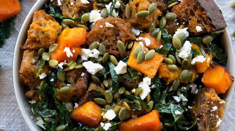 As for the salad itself, there are many ways to jazz it up using kale. You can go with the classic route of adding kale to a pre-existent panzanella salad recipe. This is a foolproof choice for keeping things simple but still tasteful. Of course, there's also no harm in a little experimenting. Use kale in conjunction with other leafy greens such as spinach and arugula, or roasted veggies like squash, sweet potatoes, Brussels sprouts, or broccoli. Kale also goes exceptionally well with fruits, most commonly apples and berries. For something a little more playful, give your kale panzanella salad a Mediterranean twist with the use of chickpeas, feta cheese, and olives. And of course, some protein is always good to toss in. If you have the time, grill chicken breasts and throw in some lettuce to make a delightful hybrid of Caesar and panzanella.