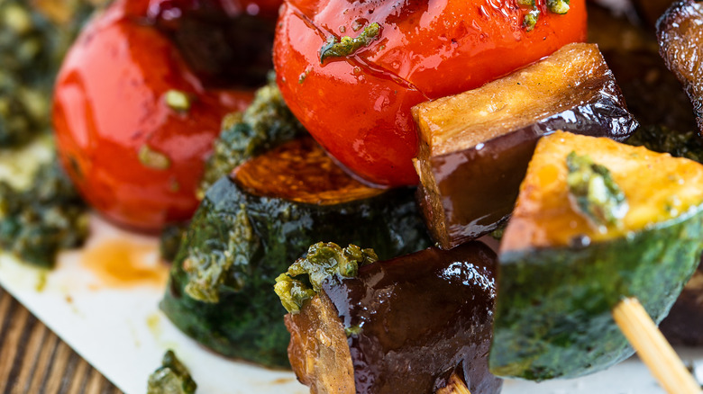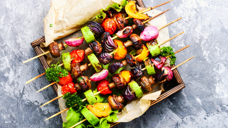 If you decided to eat a more plant-based diet and gave up your grill because of it, you've made a mistake. Gone are the days of grill-outs being dominated by ribs, hot dogs, and hamburgers. Modern grills are loaded to the brim with corn, onions, pineapple, red pepper, zucchini, portobello caps, and meat alternatives. Perhaps the biggest hiccup comes with trying to keep sliced fruits and veggies from falling through the grates to their fiery doom, but grill masters are innovative, and we've come up with ways to prevent such a disaster. From wood plank grilling to flat-top grilling, the options are endless, but we have a method you've likely used for both meat and vegetables before; toss them all on a skewer and enjoy kabobs. However, you may notice that veggies can be trickier to keep on those little wooden sticks than meat, so we've listed the best plant-based foods for grilling kabobs to help keep the good times rolling, sans frustration and lost soldiers.