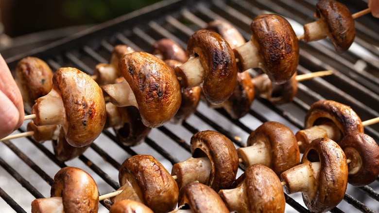 Now, if you're a seasoned kabob maker and grill master, then you're well aware that baby 'bella mushrooms taste fantastic when grilled but are frustrating to pierce with a skewer. On paper, they are the perfect size and shape, so why do they make us want to rip our hair out? Well, uncooked mushrooms are stiff yet delicate, and split easily when pierced. So, even if you're piercing through the stem or the side, you will likely end up with a pile of broken mushrooms. Mushroom lovers, don't fret. There is a solution, and it just happens to be the unexpected way to get perfectly grilled mushrooms, every time.